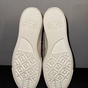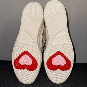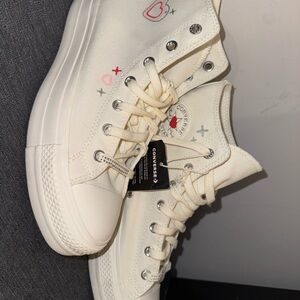 Chic Converse high-tops in cream. Features red and pink heart accents. Stylish and comfortable for everyday wear.