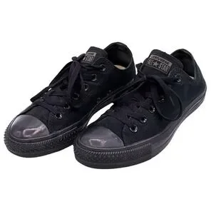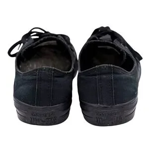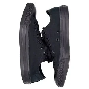 Converse Chuck Taylor All Star Low Top sneakers in a sleek monochrome black-on-black colorway. These classic canvas shoes feature a durable textile upper, matching black rubber midsoles, and the iconic All Star branding on the tongue and heel. The tonal design offers a versatile, understated look suitable for various casual styles.