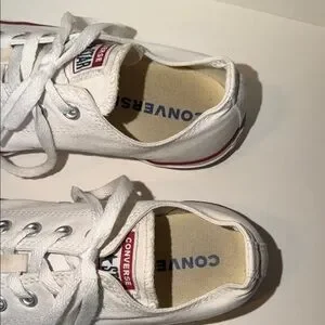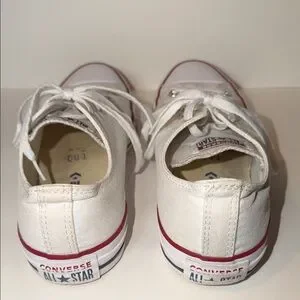 Classic white Converse Chuck Taylor All Star low-tops. These iconic canvas sneakers feature the signature rubber toe cap and "All Star" branding.