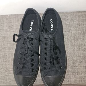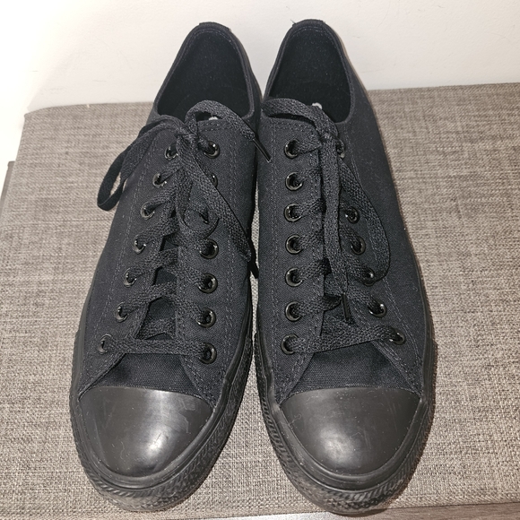 Converse Chuck Taylor All Star Low-Top sneakers in a monochrome black colorway. Unisex Size 9 Mens or 11 Womens.