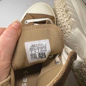 Converse Chuck Taylor All Star Lugged 2.0 Hi Shoe in Sand Dune Floral, size Women's 10. This sneaker features a lace-up closure, high-top shoe shaft style, lugged platform sole, and a floral pattern on beige canvas. It offers comfort with cushioning and breathability, ideal for casual wear in all seasons. An updated version of the classic Chuck Taylor style, perfect for walking, beach outings, and everyday use.
