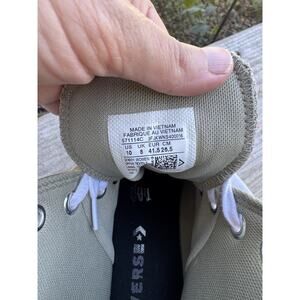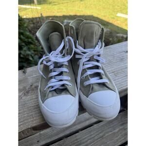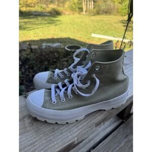 The product is a pair of Converse Chuck Taylor All Star Lugged Platform Sneakers in women's size 10, featuring a high top design in a green color with logo accents. These athletic shoes are part of the Converse Chuck Taylor All Star product line and are perfect for walking activities. The sneakers have a synthetic upper material and embody the athleisure theme, making them both stylish and functional for everyday wear. See pictures for any flaws. No box.