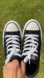 Classic Converse sneakers in black and white. Low-top design with durable canvas. Timeless style for any occasion.