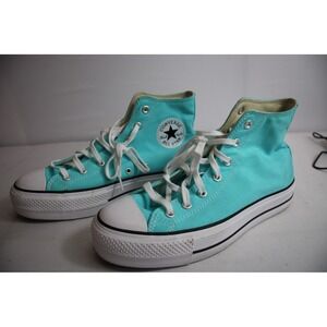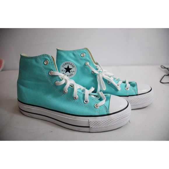 Keywords: Converse Chuck Taylor, Platform sneakers, High top shoes, Teal canvas, Women's fashion, Streetwear, Casual footwear, Lace up sneakers, Iconic style, Comfortable shoes, Everyday wear, Summer style