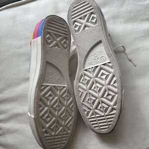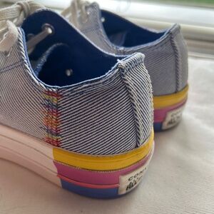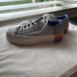 Step up your sneaker game with these fun and stylish Converse Chuck Taylor All Star platform sneakers! These are a women's size 7 and boast a vibrant blue and white speckled gradient design that's sure to turn heads. The heel is finished with the classic All Star logo, featuring cool pink, yellow, and blue stripes. The small platform provides a trendy boost in height and a modern feel.