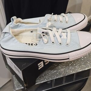 Chic Converse sneakers in sky blue. Features iconic low-top style with white laces and sole.
