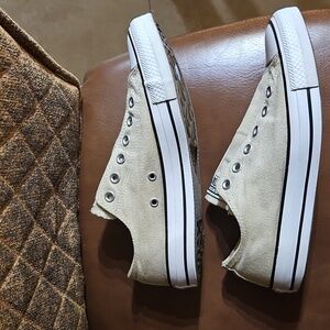 Here is a pair of Converse Chuck Taylor All Star Slip On Ox Low Top Sneakers Shoes Women's Size 9.5 Tan White. They are in good condition with the exception of a little wear and a few spots, but has lots of life left.
