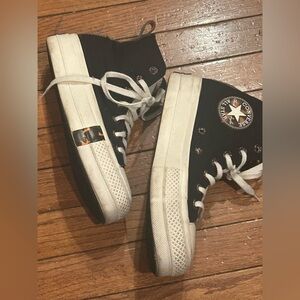 Classic Converse sneakers with a bold black and white contrast. High-top design for a timeless look. Perfect for everyday wear.