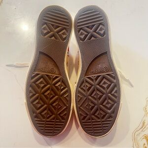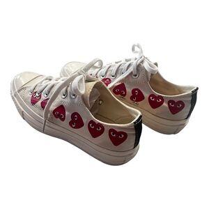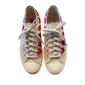 classic Converse Chuck 70 low-top silhouette with a white or cream canvas upper. The distinctive element is the repeated red heart-with-eyes logo, designed by New York graphic artist Filip Pagowski for Comme des Garçons, adorning the sides of the shoe.