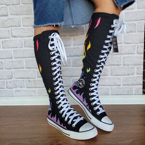 These Converse sneakers feature a vibrant rainbow flame design, ideal for those wanting to make a bold fashion statement.