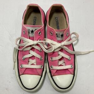 Pink Converse Chuck Taylor All Star Low Top canvas sneakers. Unisex- size 5 ladies, 3 men. #M9007. Good pre owned condition. These shoes have been cleaned but have some staining on inside. Some wear & a bit of discoloration to outsoles but bottom sole has hardly any wear. Canvas upper in good condition. Tons of life left in these classic tennis shoes. Please see pictures for condition. No box.