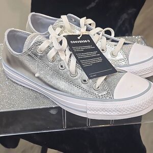 Shine with every step in these Converse women's sneakers. Featuring a sleek silver design, these shoes offer both style and comfort. Perfect for casual outings or adding a touch of sparkle to your everyday look.