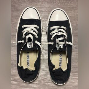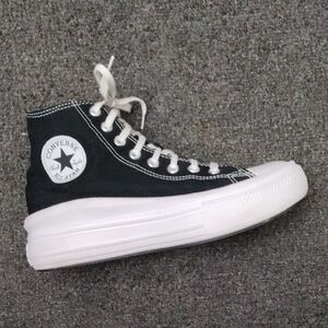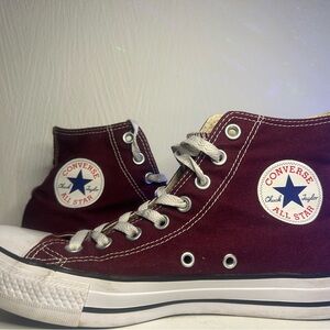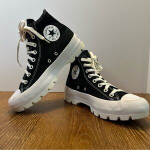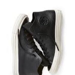 Classic Black hi-top Converse x Comme des Garcons sneakers in excellent used condition (worn 2x with scuffs in rubber as seen in photos). Features signature logo and durable design. Original box not included.