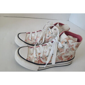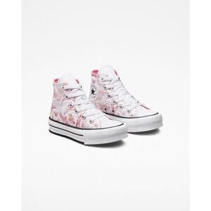 The Converse Chuck Taylor Girls EVA Lift Platform Butterfly Shine Shoes in US size 2.5 are a stylish and comfortable choice for young girls. These high top platform shoes feature a round toe shape, lace-up closure, and are designed for casual occasions. The white, madder pink, and black color combination adds a fun and vibrant touch to the butterfly pattern on the canvas lining. With a flat heel and foam insole, these shoes are perfect for walking and everyday wear, while the Converse brand ensures quality and style.