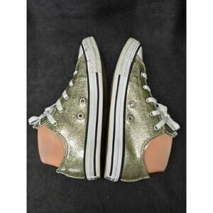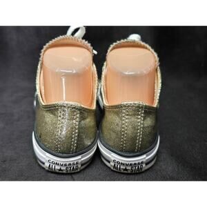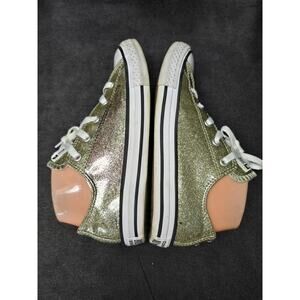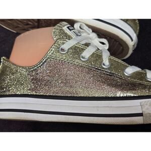 Converse Chuck Taylor Glittery Gold All Star Low Top Sneaker Lace Up Tennis Shoe. Has some coloring on the outside of the right shoe as pictured, otherwise great shape.