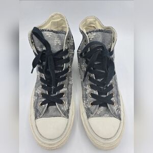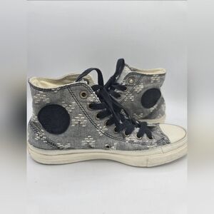 Retro Converse Chuck Taylor All Star high-top sneakers in gray patterned canvas. Classic lace-up style with rubber toe cap and durable sole. Comfortable, versatile, and easy to wear.