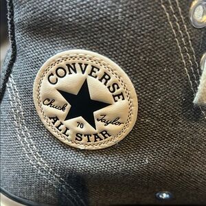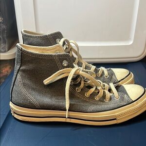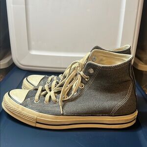 Classic Converse Chuck Taylor high-top sneakers in gray with white accents. Iconic style for everyday wear. Barely used, our loss your gain