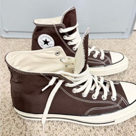 Classic Converse Chuck Taylor high-tops. Brown canvas with white accents. Ideal for everyday style.