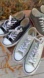 Stylish Converse low tops in black, cream, and olive. Features classic lace-up design.