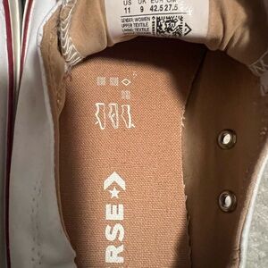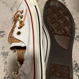 Very gently worn white Converse Shoreline slip-ons with elasticized back for easy on/off comfort. Classic low-top silhouette with tan laces and red stripe detail.