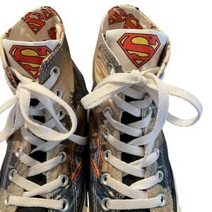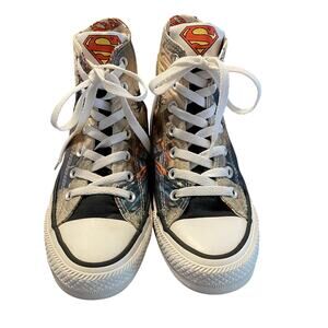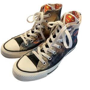 Converse Chuck Taylor Superman High Tops. Size women’s 6 or men’s 4. Converse All Star and DC Comics collaboration high tops featuring Superman. Textile upper and rubber sole. Cushioned insole. Lined in Superman logo fabric. Excellent preowned condition. 1” heel.