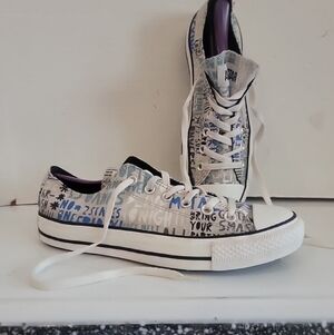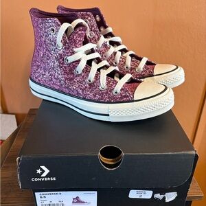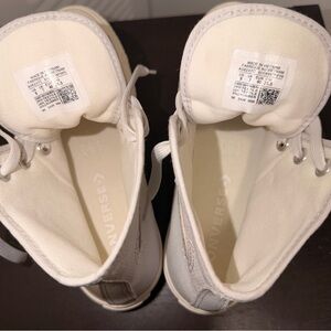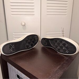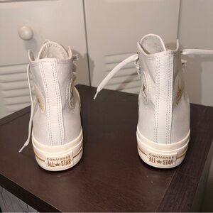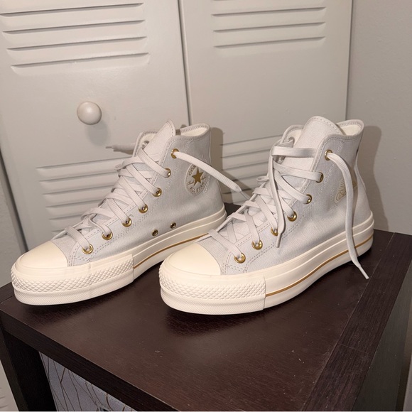 Elevate your look with these Converse Chuck Taylor high-tops. White canvas with gold accents. Stylish and versatile for any occasion. Size 9