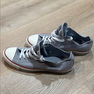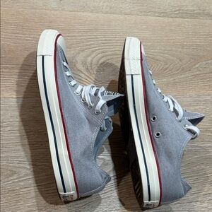 Classic Converse sneakers in gray with white laces. Features red trim for a pop of color.