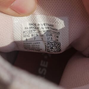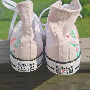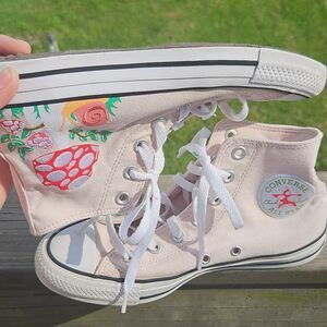 Add some whimsical flair to your look with these Converse Chuck Taylor All Star “Mushroom Garden” high-top sneakers. Featuring a playful garden design with mushrooms, snails, and foliage on a light blush pink canvas. Unisex sizing—women’s 7, men’s 5 (EU 37.5, CM 24). Classic rubber toe cap and sole. Lightly worn with minor scuffs on the toe and some wear on the soles. A fun and stylish addition to any casual wardrobe!