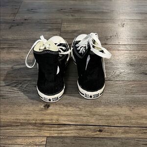 Timeless black canvas sneakers with white accents. Features signature Converse logo. Durable and stylish.