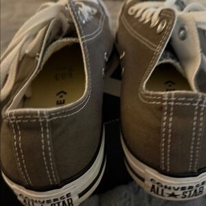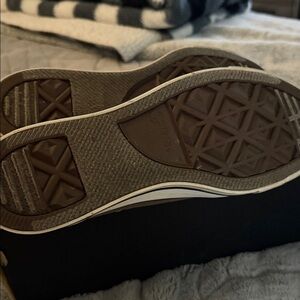 Brown canvas sneakers with white laces. Iconic Converse style.