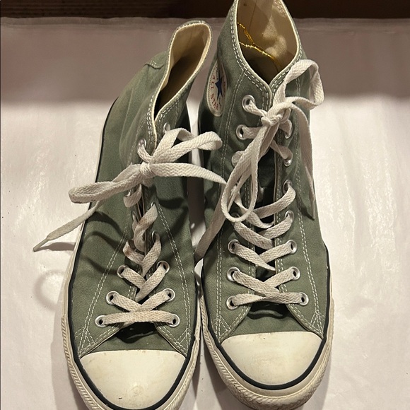 Iconic Converse high-tops. Olive canvas with white laces and rubber soles. Timeless style.