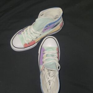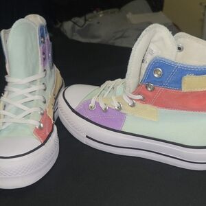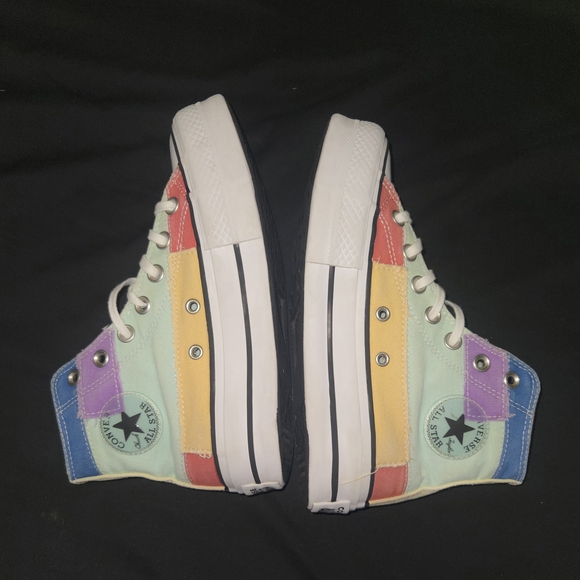 Bold Converse high-tops with vibrant color blocks. Features red, yellow, green, blue, and purple panels. Classic style with a modern twist. no box few marks an few light stains on shoes check pics