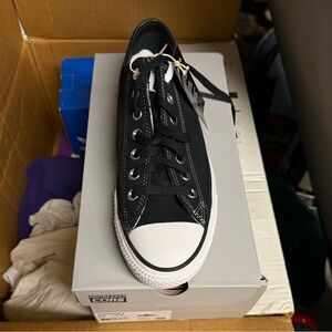Sleek black Converse sneakers with white accents. Timeless low-top design. Ideal for everyday wear.