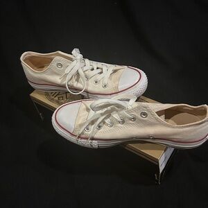 Stylish Converse low-tops in cream. Features classic lace-up style and durable rubber soles. Worn a few times and comes with original box!