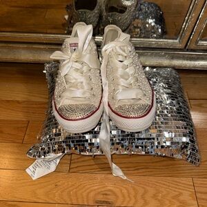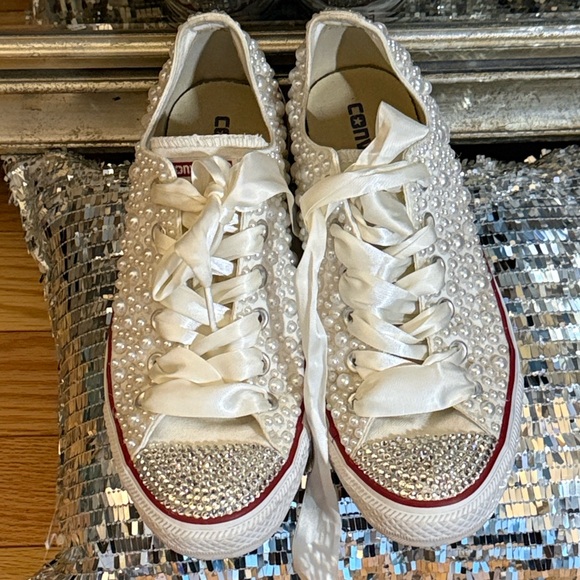 Elegant Converse sneakers with pearl embellishments. Features cream satin laces for a chic look. Some wear but in egoistic condition! Wore them for my wedding as they were VERY comfortable.