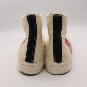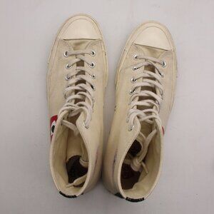 Cream high-top sneakers with red heart design. Iconic Converse style. Comfortable and stylish.