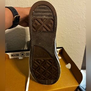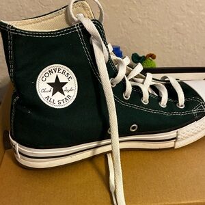 Classic Converse high-tops for women. Dark green with white accents. Perfect for casual wear. Like new in box and discounted shipping