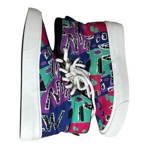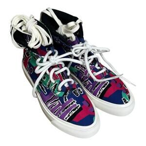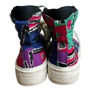 The Converse Skid Grip Hi Fear Of God features a Limoges, Egret, and Simply Green canvas upper, with the entire upper covered in an archival print pattern that includes shades of black, white, blue, red, purple, and the greenish-blue of Limoges in various patterns throughout the material.