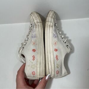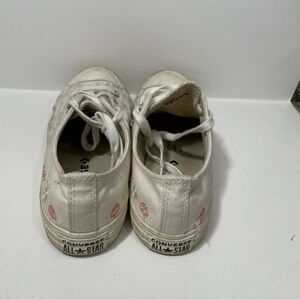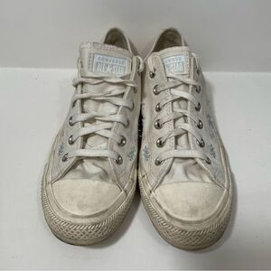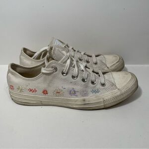 Gently worn women's size 9.5 Converse Floral Embroidered White Casual Sneakers. Please review all photos for any signs of wear-pictured as is. Disclaimer: Any items with any wear/staining has not been treated, and unsure of ability to remove/treat condition. Comes from a smoke free home, bundle with other items to save & minimize shipping cost.