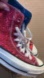 Sparkling high-top sneakers. Red and blue glitter design. Classic Converse style.