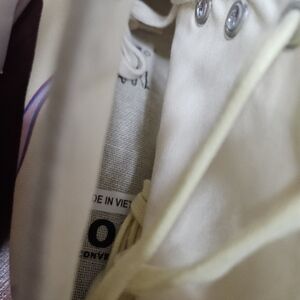 Cream Converse high-tops with vibrant pink and purple accents. Eye-catching design for a bold look. Size 11.5 Mens. Size 13.5 Womens
