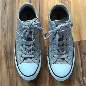 These Converse sneakers feature a striking gray and white finish, offering a classic low-top look. The shoes are designed with white laces, a durable rubber toe cap, and a comfortable rubber outsole, making them perfect for everyday wear.
