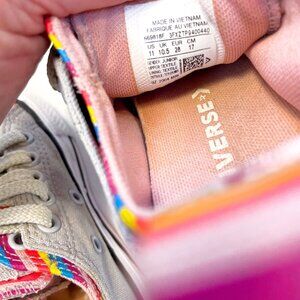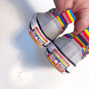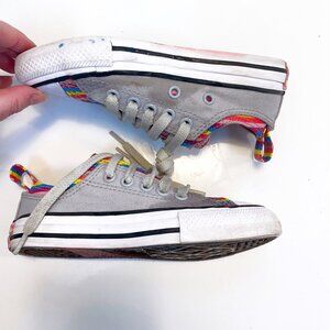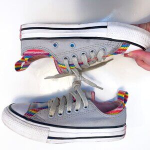 Low top lace up sneakers. Gray canvas with rainbow trim.