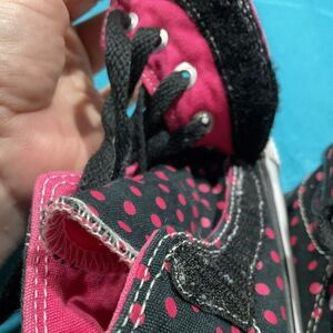 Infant size 7, excellent preowned condition. Black w/ pink polka dots, side opens for easy on and off.
