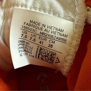 Wicked cool “Not A Chuck 70 UNTITL3D” high top sneakers by Converse. White with black graphics and bold orange interior lining. Men’s size 7.5. Can also be worn by women, fits a women’s 9.5 according to the sizing chart: please see photo section. Excellent gently used condition—please view all photos.