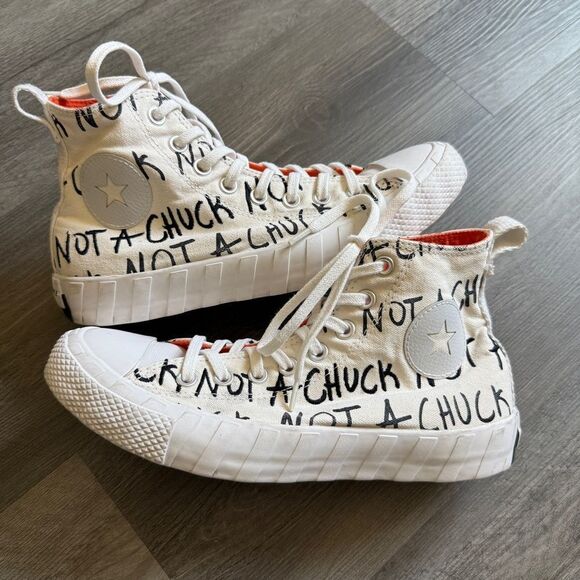 Wicked cool “Not A Chuck 70 UNTITL3D” high top sneakers by Converse. White with black graphics and bold orange interior lining. Men’s size 7.5. Can also be worn by women, fits a women’s 9.5 according to the sizing chart: please see photo section. Excellent gently used condition—please view all photos.