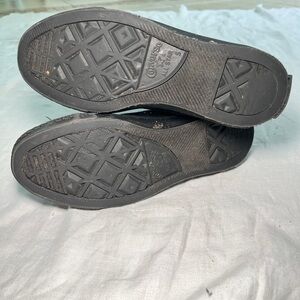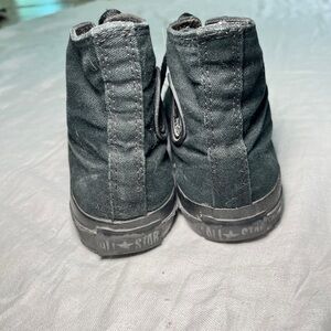 This product is a pair of black high top Converse All Star sneakers in men's size 5 and women's size 7. Made of canvas with a rubber outsole, they feature a lace-up closure and a solid pattern. Ideal for casual occasions in the summer, fall, or spring, these sneakers offer comfort and style, making them a versatile option for everyday wear. The iconic Converse brand and star theme add a classic touch to these timeless sneakers. Made in Vietnam, they are a comfortable and fashionable choice for any casual outfit.