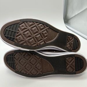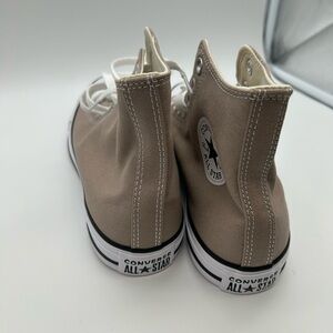 Classic Converse high-top sneakers. Tan canvas with white laces. Iconic logo on the side.