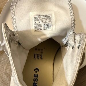Selling well used Converse Chuck Taylor All Star high-top sneakers. White canvas with red and blue accents. Iconic design with lace-up closure. Sold as is. Men’s size 8 but fits larger. CTAS