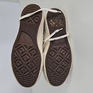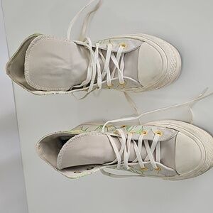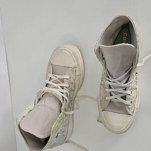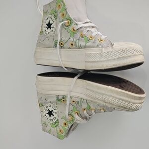 Stylish Converse high-top sneakers. Features green and yellow floral accents. Classic design with a unique twist.